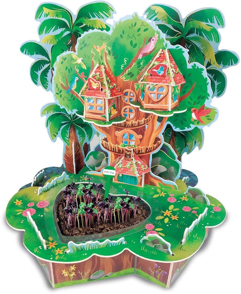 Construis ta maison dans les arbres et crée ton jardin intérieur avec de vraies plantes. Contient des panneaux en carton, 1 pots en forme de cœur, 1 pipette, 1 sachet de terre et 1 sachet avec des graines.