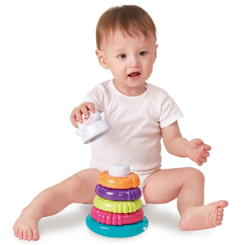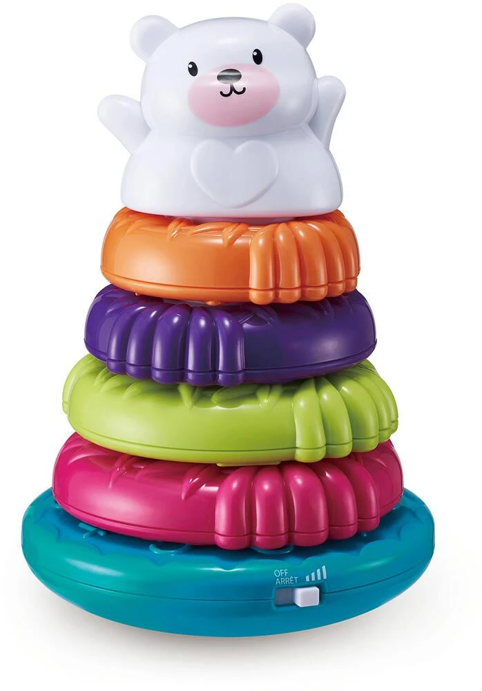 Bébé développe sa motricité en jouant avec son ourson à empiler ! Développement de la motricité fine et de la coordination main-oeil en empilant les anneaux de différentes couleurs et formes sur la tige centrale. Chaque anneau contient de petites billes, pour l’éveil de bébé. Un son retentit à chaque fois que bébé place un anneau, pour l’encourager et lui faire découvrir les relations de cause à effet. Lorsque l’enfant arrive à positionner toutes les pièces, cela déclenche des comptines ! Base culbuto lestée.