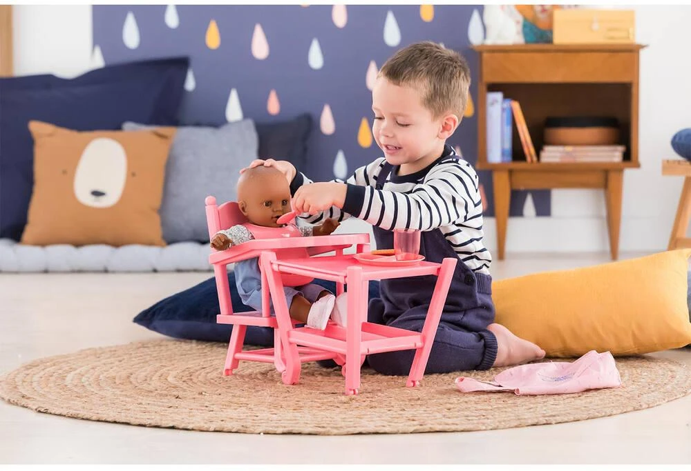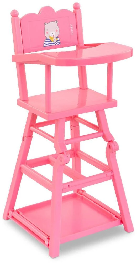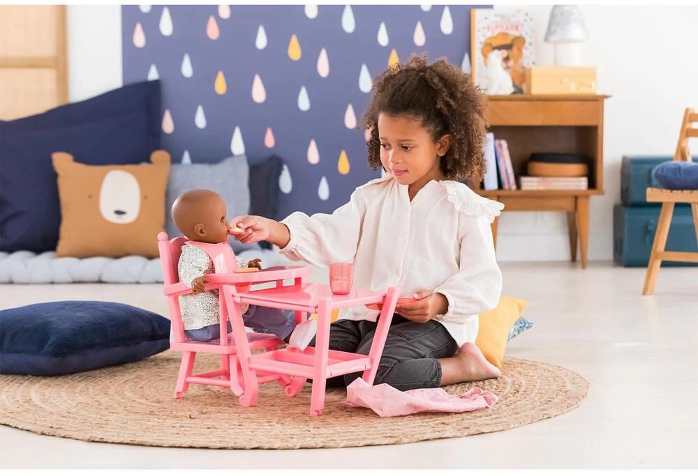À table ! La Chaise Haute est adaptée aux grands poupons de 36 à 42 cm Corolle. Elle est 2 en 1 : elle se place en position haute comme celle d’un vrai bébé ou en position basse pour faciliter le jeu assis. Sur sa petite tablette, on peut poser le repas de son grand poupon. Plus que jamais, les enfants vont adorer donner à manger à leur grand poupon !
