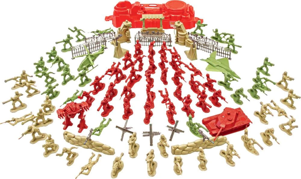Construis ta propre armée ! 104 pièces au total. Set de jeu complet. Set de jeu complet. 3 armées, des accessoires et des véhicules inclus ! Le couvercle de la boîte est amovible : c’est une base de QG à partir de laquelle tu peux lancer des opérations militaires. Contient 80 soldats dans différentes positions et 24 accessoires dont des armes, des véhicules, des clôtures …pour lancer une bataille. Design des soldats très détaillé et dans différents coloris. Soldats d’environ 4.5 cm. Pratique tout se range et se transporte dans la boîte avec couvercle à clips et poignée de transport. En plastique. Instructions imprimées sur la boîte. Intérêt pédagogique : encourage l’enfant à utiliser son imagination. Dimensions : boîte fermée 24.13 x 8.89 x 25.40 cm, base de QG 28.2 x 8.8 x 5.9 cm.