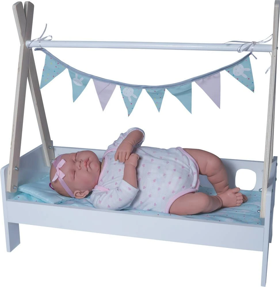 Lit cabane avec décoration en tissu. La couette peut se transformer en long coussin pour canapé. Pour poupée jusqu’à 45 cm (non fournie). L’assemblage doit être effectué par un adulte. Notice incluse.