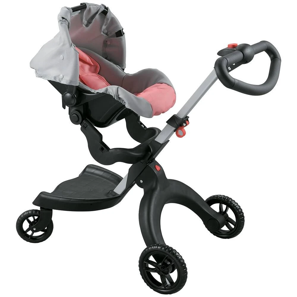 Pour poupée jusqu’à 46 cm (non fournie). Facile à manœuvrer, roues avant directrices. Le porte-bébé peut être réglé en position assise ou couchée. Le porte-bébé est amovible : il peut aussi être utilisé comme un siège auto. Réglage facile pour orienter vers l’avant ou vers l’arrière : il suffit de retirer le porte-bébé et de le positionner dans le sens souhaité. La poignée est réglable selon la hauteur de l’enfant : de 41.5 à 78 cm. Siège avec harnais de sécurité. Capote ajustable. Roues silencieuses. Le châssis est pliable et la nacelle amovible : pour un rangement et un transport plus aisés. Facile à assembler. L’assemblage doit être effectué par un adulte. Instructions de montage incluses. Matières : en plastique, tissu (polyester), métal et mousse EVA. Poids net de la poussette : environ 2.9 kg.