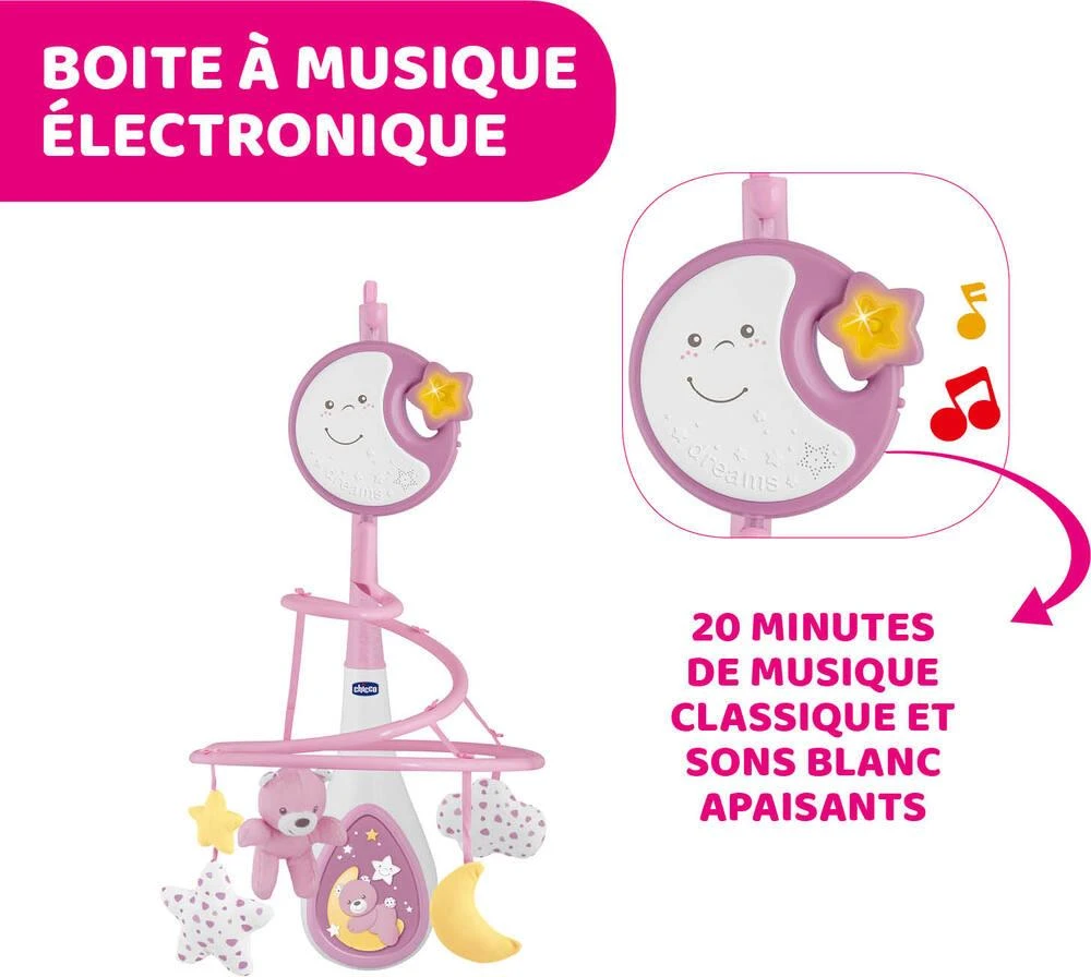 Mobile au système de fixation pratique permettant de le fixer sur les berceaux pleins et à barreaux. 20 minutes de musique classique et bruits blancs et une douce veilleuse berceront bébé et l’emmèneront vers le pays des rêves. Sa partie électronique et lumineuse détachable apaisera Bébé en promenade. Attention ! Afin d’éviter tout risque de blessure suite à un enchevêtrement, ôter le jouet dès que l’enfant tente de se mettre à quatre pattes ou de ramper.
