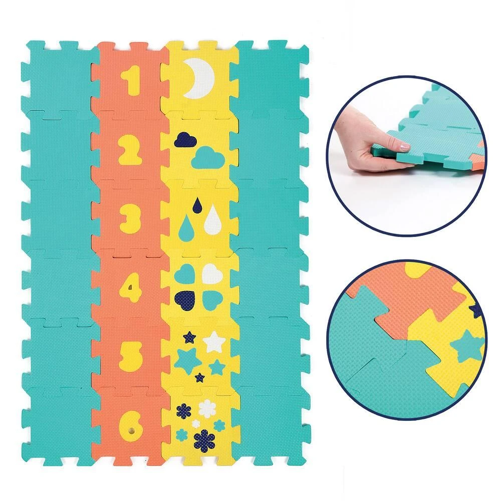La petite taille des dalles permet un jeu de construction (cubes, etc.). Place Ă l’ingĂ©niositĂ© ! Les chiffres sur les dalles permettent aux enfants d’apprendre Ă compter. Les dalles aux formes imprimĂ©es sont pensĂ©es pour ĂŞtre liĂ©es aux chiffres. Ainsi l’enfant peut associer le chiffre 2 avec les 2 nuages ; le chiffre 3 avec les 3 gouttes, etc. En raccordant les chiffres avec les formes, les enfants dĂ©velopperont la notion des quantitĂ©s. Astucieuses, les dalles offrent une activitĂ© d’encastrement des chiffres en plus du puzzle. Des jeux ludiques et pĂ©dagogiques. Les couleurs vives des jouets attirent l’attention des enfants. Ces jeux rĂ©sistent facilement au temps et aux gestes brusques. SpĂ©cialement conçu pour les Ă©crasements et le confort, les enfants ne pourront pas se faire mal en cas de petites chutes. Les diffĂ©rentes textures des jouets et leurs couleurs toniques encouragent la motricitĂ© fine, la dextĂ©ritĂ© et l’acuitĂ© visuelle de votre enfant tout en stimulant son imagination. Très rĂ©sistants, les jouets sont Ă l’épreuve des mâchouillements et des jets en tous genre ! Nettoyage simple avec un chiffon humide des quilles et des formes. Dalles lavables Ă la main Ă froid et rĂ©sistent Ă la dĂ©formation. Attention ! AĂ©rer les mousses 48h avant leur utilisation.