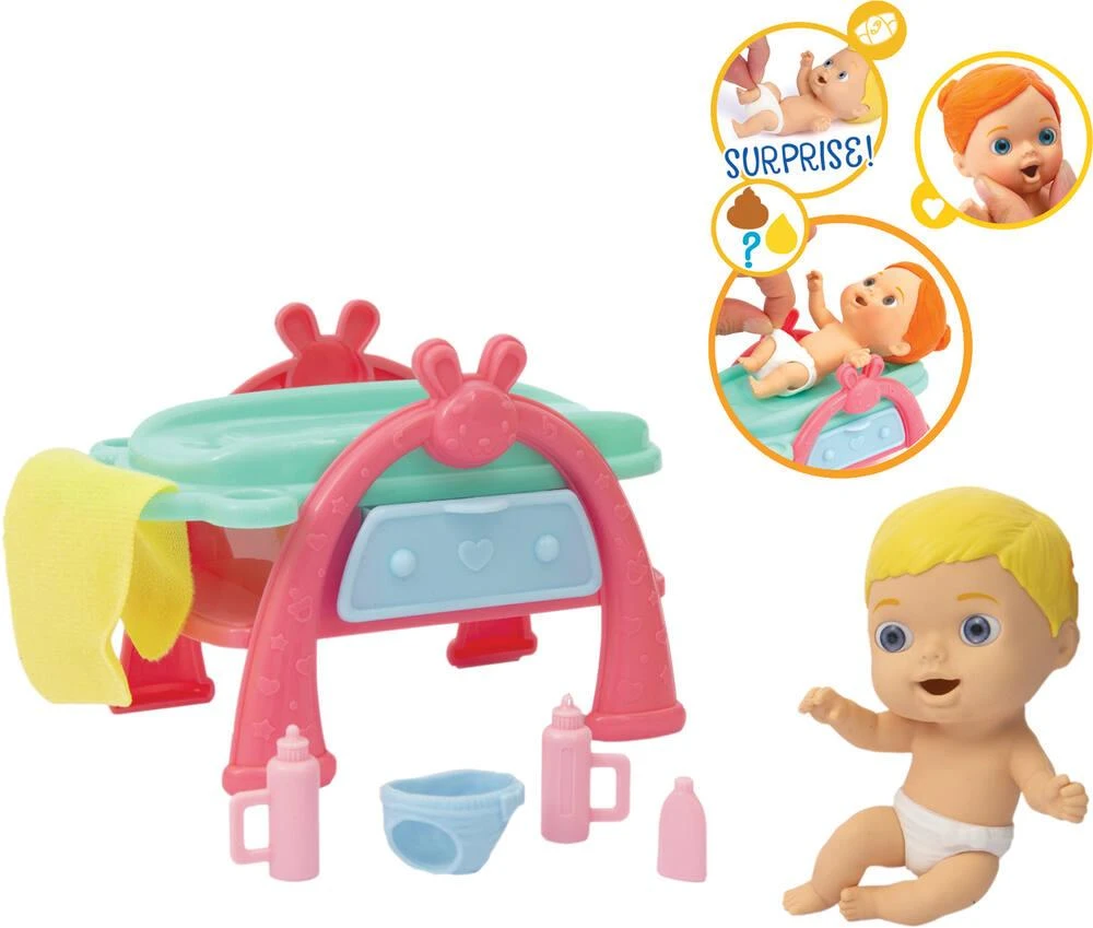 Des petits bébés souples qui se comportent comme de vrais bébés. Ils font des mouvements du corps étonnants, avec plein d’expressions de visage amusantes! C’est l’heure de changer ton Cicciobello… Installe-le sur la table à langer et prends soin de lui avec tous les accessoires inclus! Quelle surprise vas-tu découvrir dans sa couche…un pipi ou un caca. CONTIENT: 1 Cicciobello (modèle Fille ou Garçon), 1 couche coloré, 1 couche avec une surprise (pipi ou caca), 1 table à langer, 1 serviette, 1 bouteille de talc….
