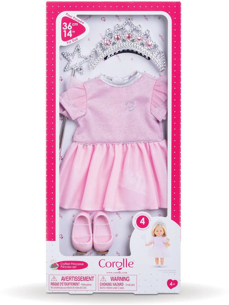 Coffret pour jouer à la princesse avec sa poupée ma Corolle. Contient 4 accessoires factices : 1 robe de princesse; 1 diadème; 1 baguette magique et 1 paire de ballerines. ma Corolle : Ma poupée; Mes histoires ! tissus 100% polyester – tulle – 100% nylon – accs plastiques – Pour poupée ma Corolle 36 cm –
