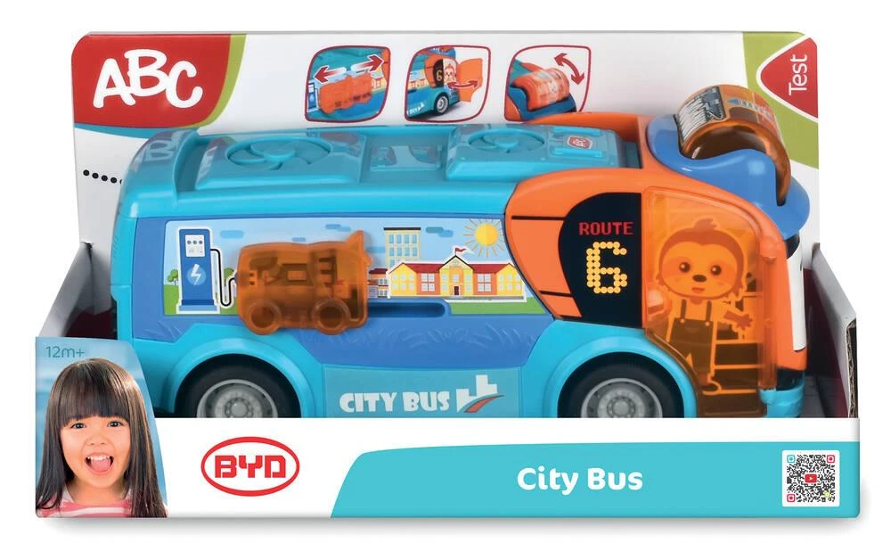 Bus premier âge 22cm à roue libre avec une porte battante qui cache une image amusante, un curseur sur le côté et un rouleau sur le dessus pour indiquer la destination.