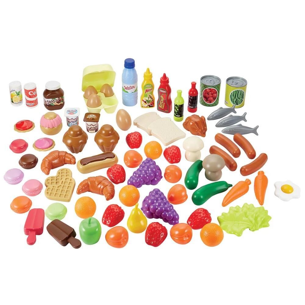 Une boite solide et pratique pour le rangement remplie de 75 accessoires pour jouer à la dinette dont des gaufres, des yaourts, un pot de pâte à tartiner, des boites de conserve, des fruits et légumes, etc.