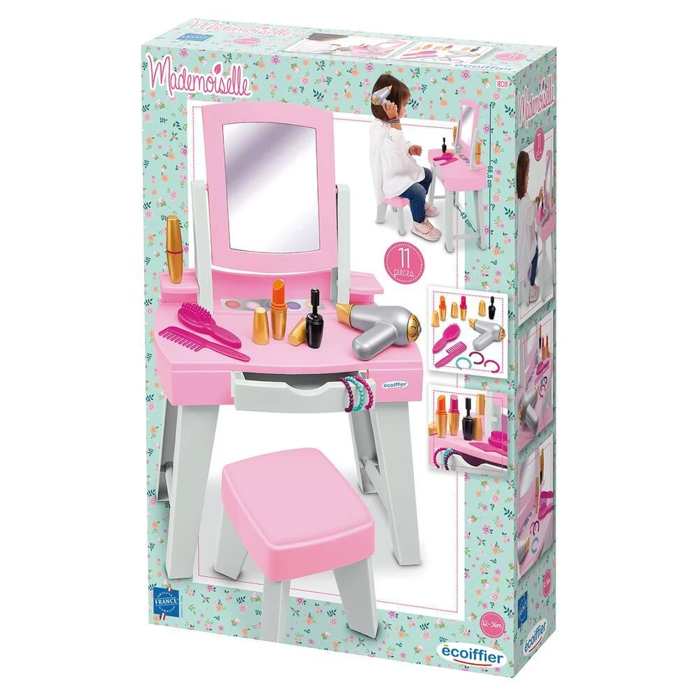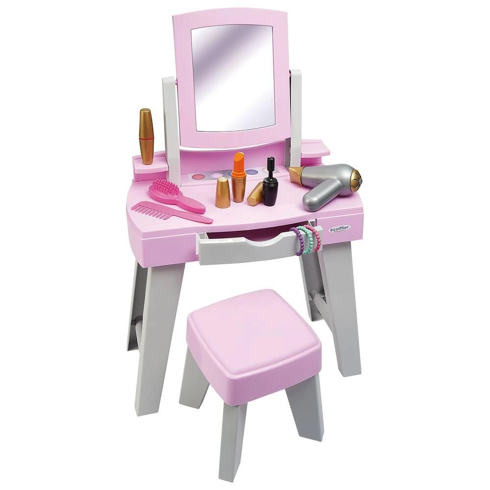 Avec miroir et tabouret. Range les accessoires inclus (peigne, brosse, bracelets, maquillage…) !