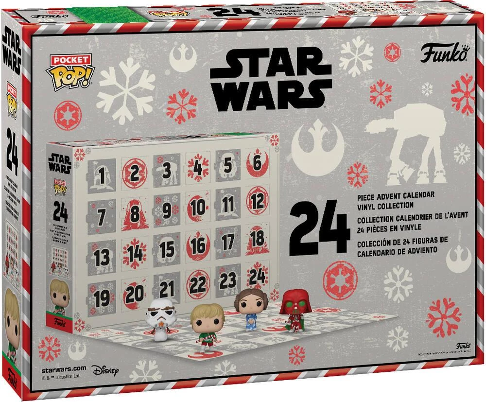 Calendrier de l’Avent 2022 sur le thème Star Wars Holiday. Série Pocket Pop! Licence : Star Wars. Contient 24 mini figurines de 4 cm en vinyle. Découvre 1 figurine différente chaque jour en attendant Noël. Dimensions de la boîte : 38 x 6 x 27 cm.