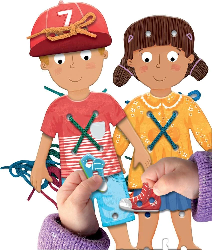 Apprends à t’habiller en mettant les vêtements que la roue a choisi aux personnages. 2 personnages, vêtements, 4 lacets pour attacher les vêtements et 1 roulette fournis.