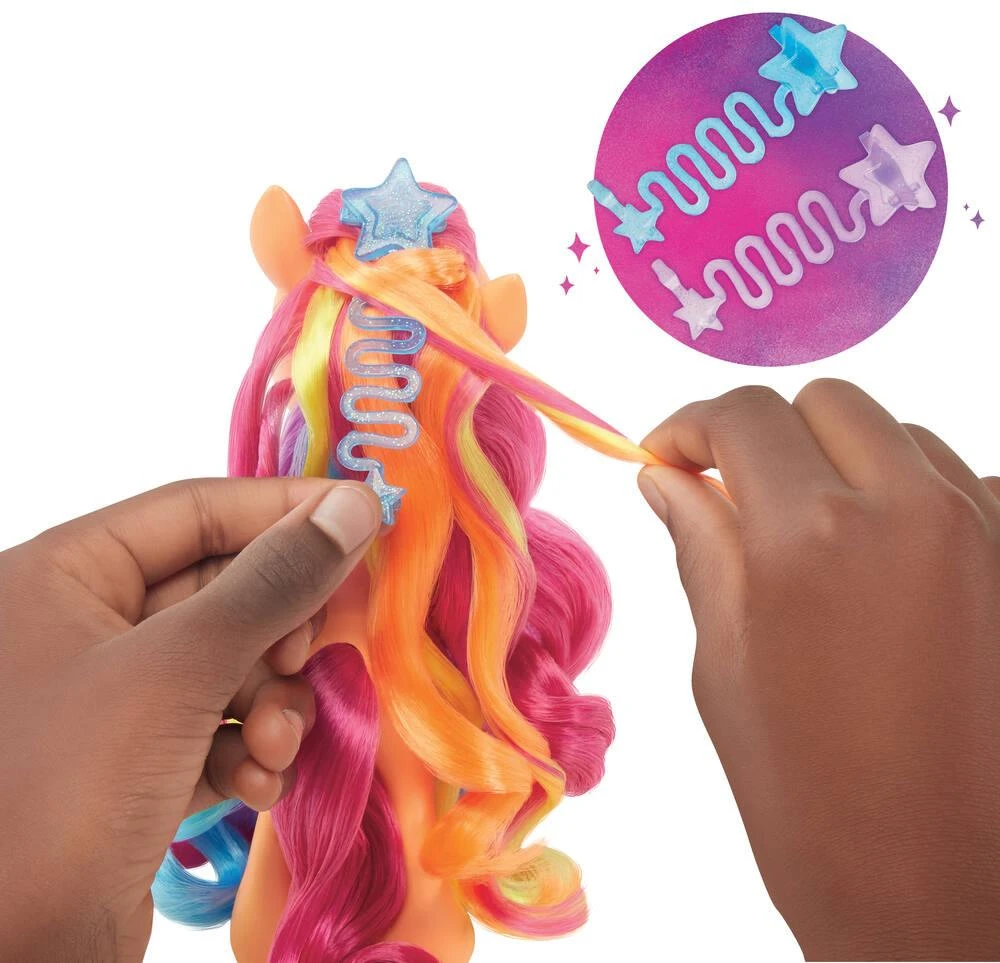 Sunny Starscout est rayonnante avec sa crinière arc-en-ciel ! Ce poney Sunny mesure 15 cm et est accompagné de 17 accessoires de mode et de coiffure. Fais lui une tresse pour révéler une magnifique coiffure arc-en-ciel et utilise les accessoires pour reproduire des moments du film. Les enfants peuvent également mettre les accessoires sur eux et porter des tatouages temporaires pour ressembler à Sunny.