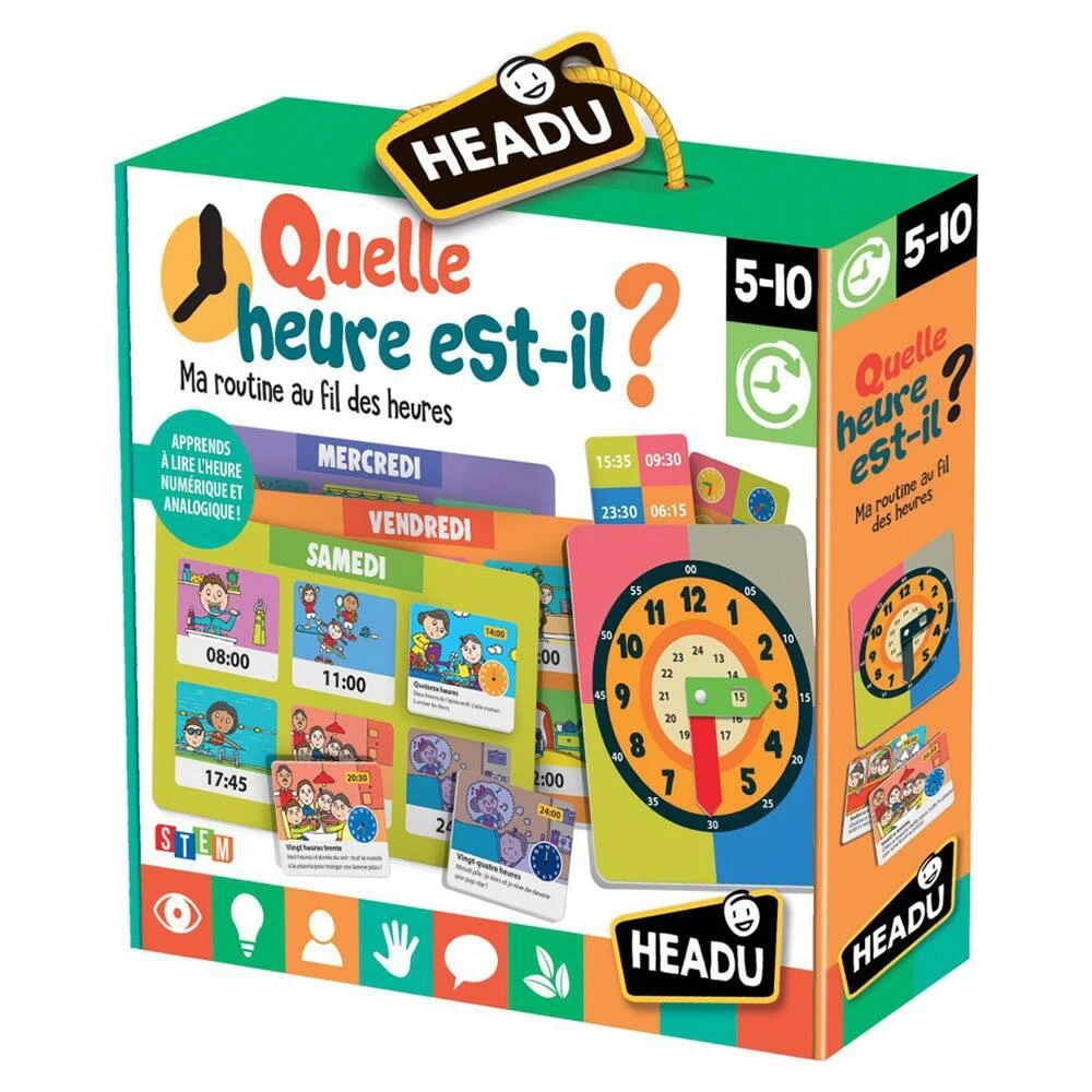 Ce jeu éducatif de la marque Headu permettra aux enfants d’apprendre : L’heure numérique et analogique, La journée et la semaine, Le temps cyclique et les concepts temporels.