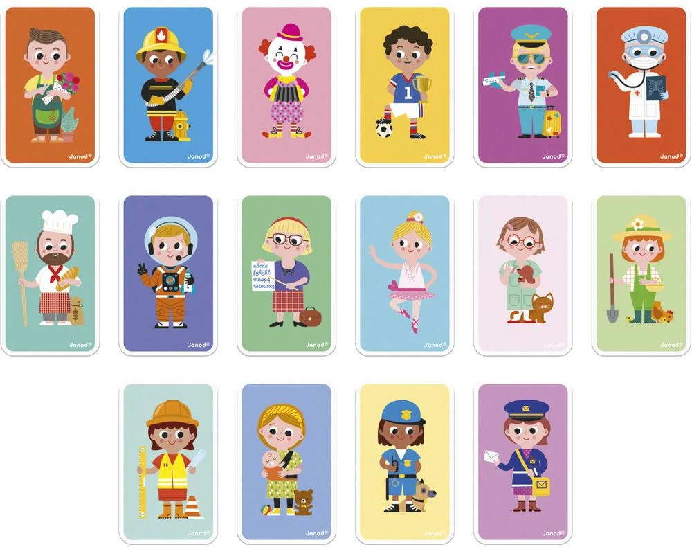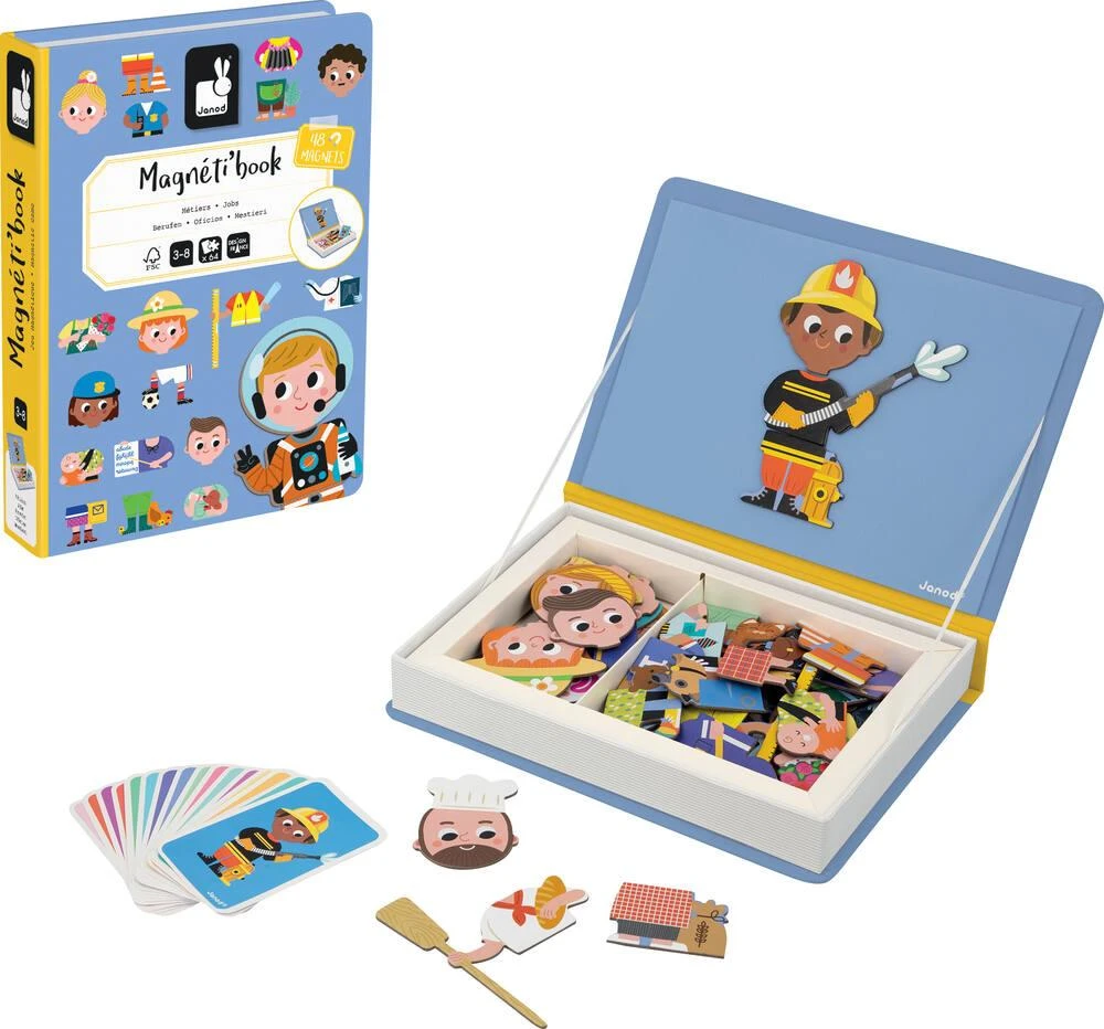 Quand je serai grand(e), je serai…. Ouvre ton magnĂ©ti’book pour partir Ă la dĂ©couverte des mĂ©tiers ! Avec ce joli jouet magnĂ©tique colorĂ©, votre enfant dĂ©couvrira 16 mĂ©tiers, avec la possibilitĂ© d’en inventer plein d’autres ! Il est composĂ© d’un support magnĂ©tique, de 48 magnets et de 16 cartes reprĂ©sentant des mĂ©tiers connus. Les plus petits comme les plus grands s’amuseront Ă reproduire les modèles et Ă les mĂ©langer pour imaginer des mix de mĂ©tiers tous plus farfelus les uns que les autres. Jouet magnĂ©tique en carton FSC™ pour les enfants –
