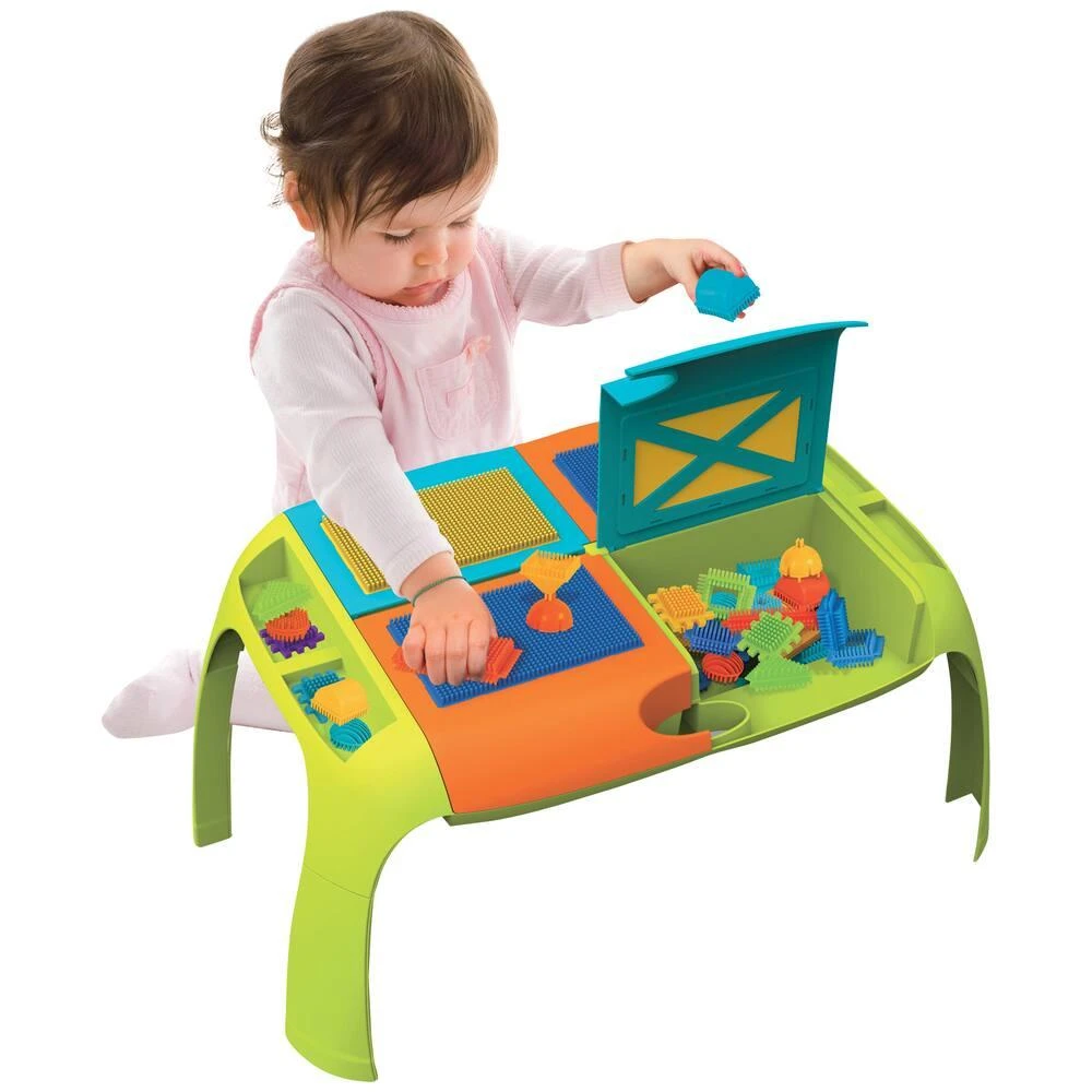 Table d’activités en plastique (polyéthylène) pour des briques picots de construction livrée avec 30 pièces de construction. Système ingénieux : les blocs s’encastrent directement sur la table. Pratique et astucieux : la table se transporte facilement grâce à ses pieds repliables et sa poignée de transport. 4 cases de rangements sur le dessus, qui se soulèvent : on peut y ranger toutes les briques à l’intérieur. Facile à manipuler, ce jeu permet le développement de la coordination main/œil. Dimensions de la table : dépliée 66 x 38 x 31 cm, avec les pieds pliés 58.5 x 38 x 13 cm. Elle est compatible avec les produits du même fournisseur (vendus séparement) : 75 pièces à assembler (référence 02026900), 202 pièces à assembler (référence 02026899), 102 pièces à assembler (référence 02029109) et mon premier circuit 115 pièces (référence 02029111).