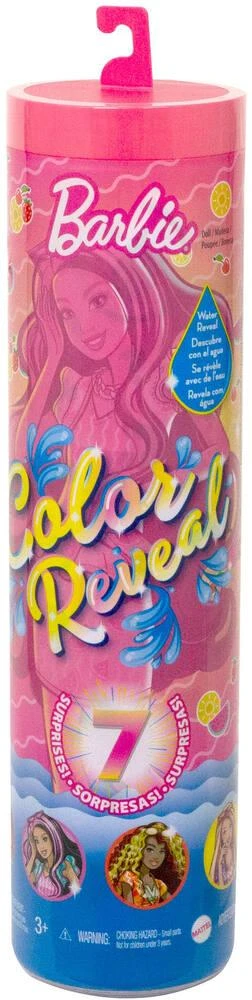 Les poupées Barbie Color Reveal offrent une expérience unique dès l’ouverture de la boîte avec pas moins de sept surprises. Il y a notamment une poupée parfumée enveloppée d’une pellicule fruitée, qui ne révélera son apparence que lorsque vous la plongerez dans l’eau ! Avec la série Sweet Fruit, les enfants découvriront l’une des cinq poupées possibles, portant chacune un parfum aux accents de cerise, de pastèque, de fraise, d’ananas ou de citron, ainsi que des vêtements et accessoires autour du même fruit, cachés dans les quatre sachets surprise. Les lèvres et les yeux de Barbie changent de couleur pour encore plus d’émerveillement. Les enfants peuvent également essayer de trouver la rare poupée accompagnée en prime d’un sac à main et d’extensions capillaires rose vif, pour imaginer encore plus d’associations et de looks différents ! Vous pouvez conserver l’emballage en forme de tube pour ranger cette panoplie et d’autres accessoires. Quelle poupée allez-vous découvrir ?Les poupées ne tiennent pas debout toutes seules. Les couleurs et les décorations peuvent varier. 1 poupée parfumée, 2 changements de couleur, 1 top imprimé, 1 jupe assortie, 1 paire de lunettes, 1 paire de chaussures.