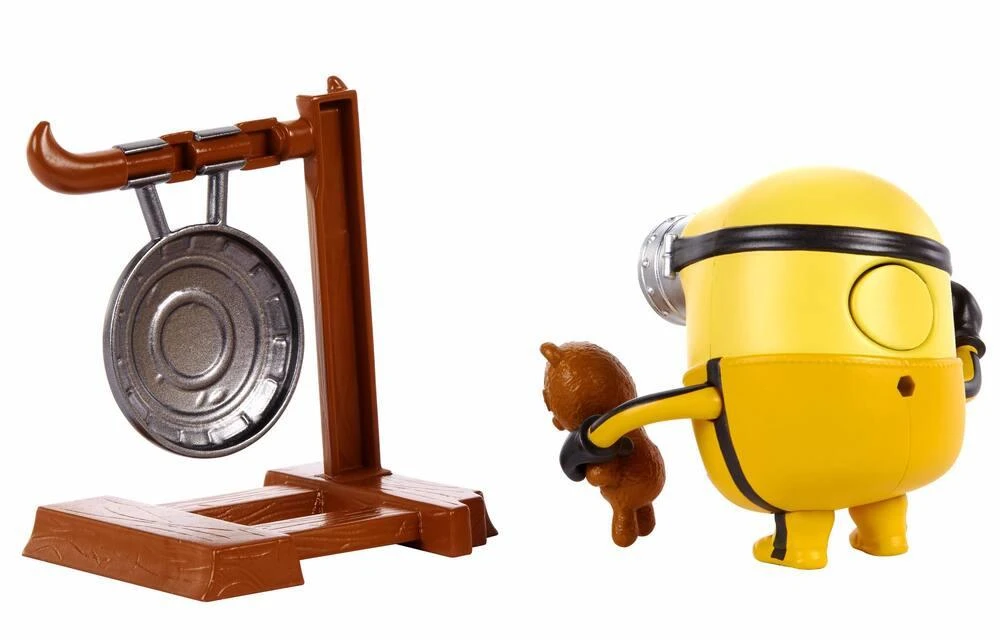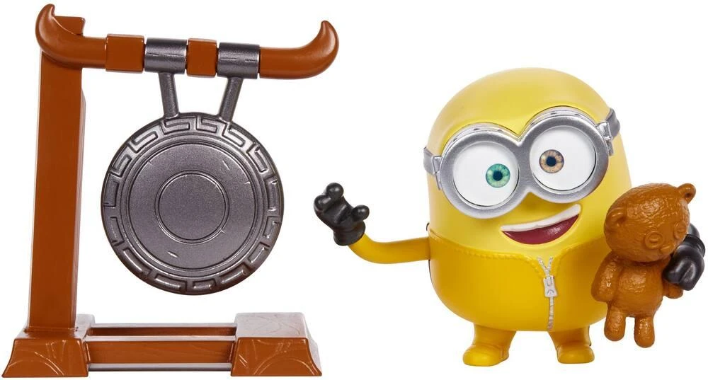 Le film Minions 2 : Il était une fois Gru raconte l’origine du plus grand méchant du monde ! Découvrez Bob en tenue de kung-fu avec son ourson Tim et un gong doré. Appuyez sur le bouton dans son dos et il frappe le gong. S’il frappe assez fort, le gong fera un tour complet sur lui-même. Pour encore plus de rire, Bob peut utiliser Tim pour frapper le gong ! Cette figurine articulée d’environ 10 cm a des poignées universelles.