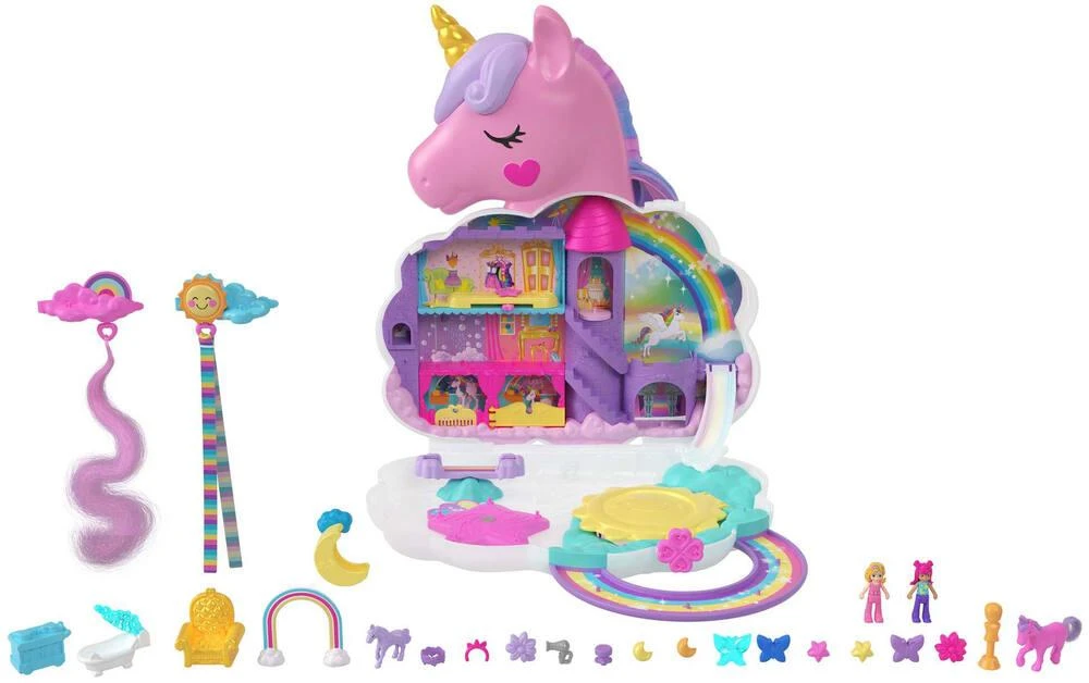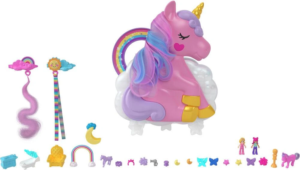 Cette belle licorne à coiffer abrite un château des espaces de jeu, 26 accessoires et 2 micro-figurines. Un arc-en-ciel sert de poignée pour l’emporter.
