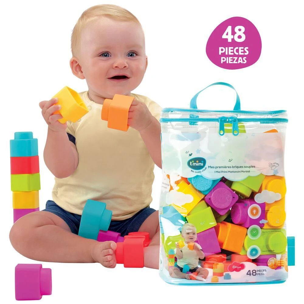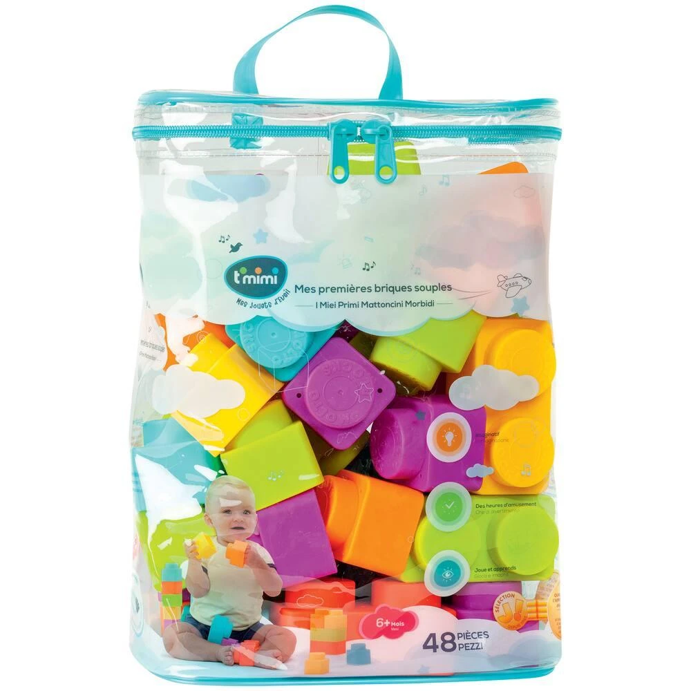 48 pièces. Briques de construction en matière douce au toucher. Amusant et facile à manipuler : bébé découvre différentes formes et couleurs. Livré dans un sac zippé en plastique transparent : pratique tout se range et se transporte dedans. Dimensions du sac : 24 x 14 x 33 cm. Développe la motricité. Stimulation sensorielle.