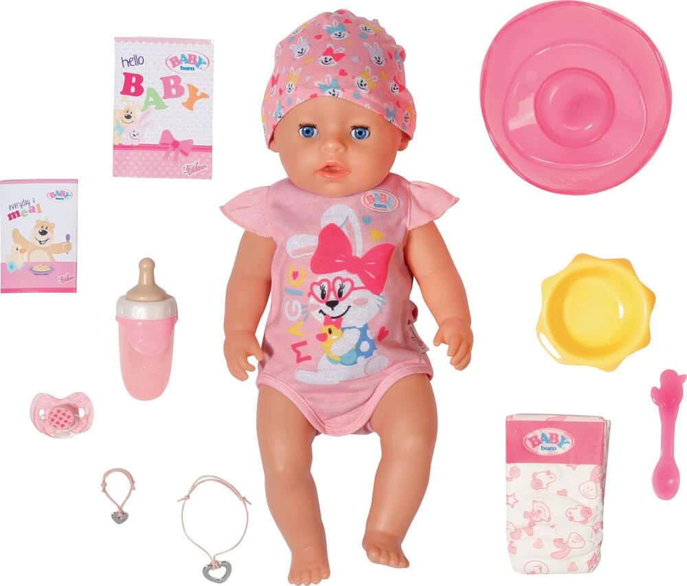 Ton poupon articulé ferme et ouvre les yeux grâce à sa sucette magique ! 10 fonctions et 10 accessoires inclus. Fonctionne sans pile.
