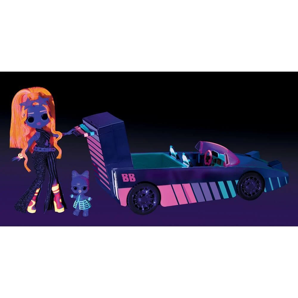VĂ©hicule avec sièges rĂ©glables, piscine et piste de danse ! Les phares s’allument. Contient 1 poupĂ©e (7,5 cm). Autres poupĂ©es non incluses.