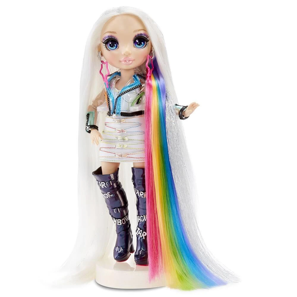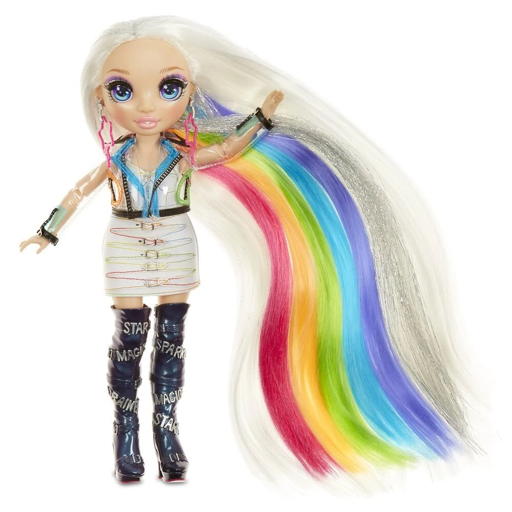 Amaya Raine a des cheveux argentés extra longs avec de magnifiques reflets arc-en-ciel cachés sous sa chevelure. Avec le kit de couleurs inclus, laissez parler votre imagination et créer des colorations extraordinaires. Puis rincez les cheveux à l’eau et recommencer de nouvelles créations ! Amaya est articulée et livrée avec une tenue complète : une jupe, un haut, une veste transparente, une paire de bottes ainsi qu’une paire de boucles d’oreille. Vous pourrez même l’exposer grâce au socle inclus. Compris dans le coffret :