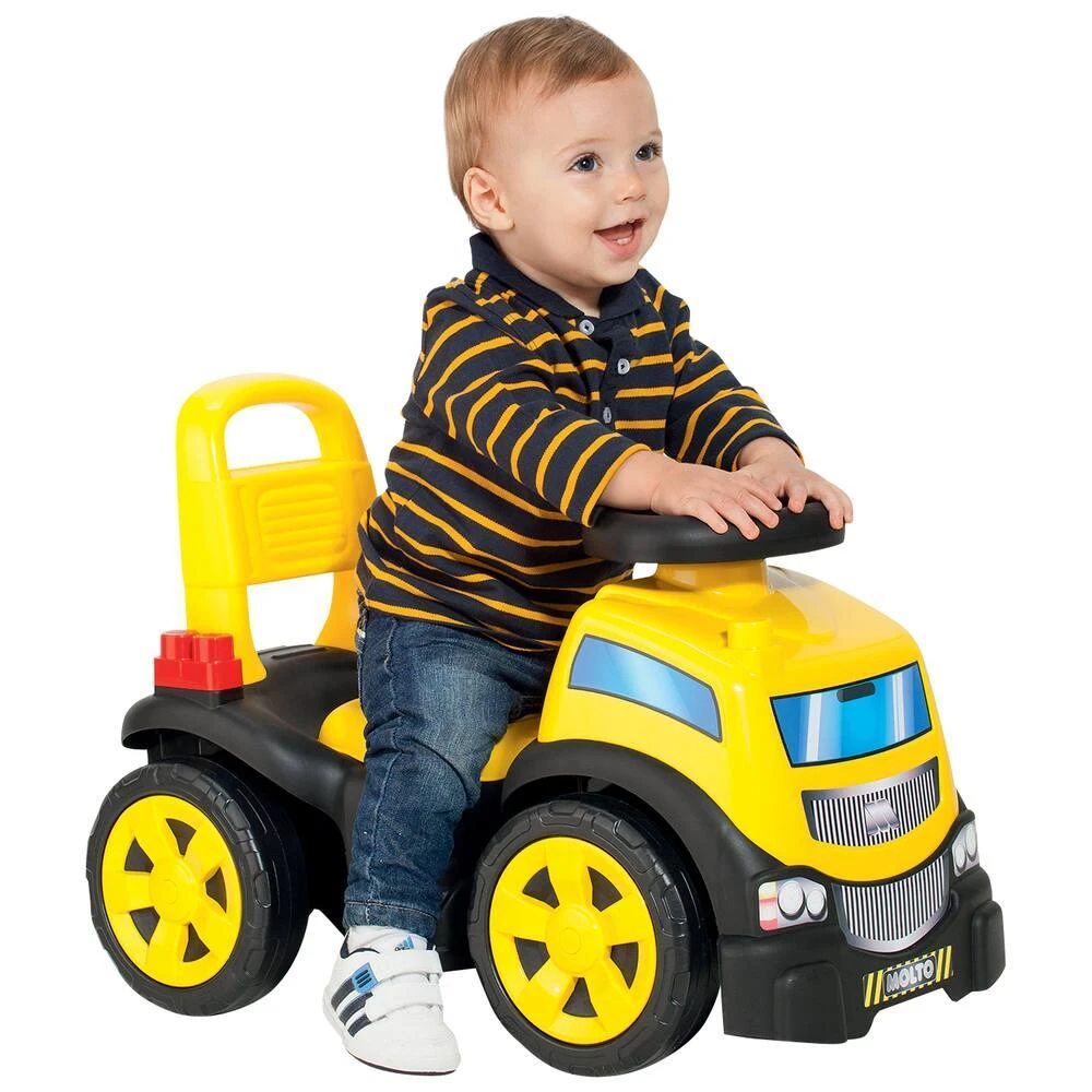 Porteur 3 en 1 en forme de camion : porteur, pousseur et jeu de construction. 10 blocs de construction inclus. Tout se range dans le coffre de rangement situé sous le siège. Tu peux aussi fixer les blocs colorés sur certaines parties du camion comme le volant ou jouer seul avec les blocs. Hauteur de l’assise : 19 cm. Poids maximum supporté par le camion : 25 kg. En plastique.