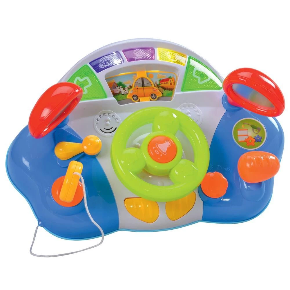 Volant avec tableau de bord. Effets sonores et lumineux. Tourne la clef pour démarrer la voiture. Volant avec klaxon. Levier de vitesse avec sons d’accélération. Avec 2 rétroviseurs rotatifs. Une manette pour déclencher les clignotants. Appuie sur les 3 boutons avec des visages en haut, pour déclencher des mélodies différentes. Stimule le sens musical de bébé. Tourne le volant à gauche ou à droite pour voir la petite voiture bouger sur le tableau de bord. Bouton arrêt (off) et 2 niveaux de volume sonore. 3 piles LR6 non fournies. En plastique.