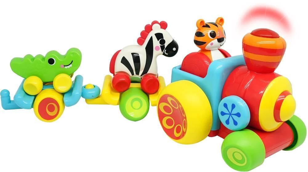 Train safari avec effets sonores et lumineux. Appuie sur la cheminée de la locomotive pour entendre de la musique et voir des lumières clignotantes. Train composé d’une locomotive et de deux wagons : locomotive avec un tigre basculant, un wagon avec un zèbre et l’autre avec un crocodile. Permet à l’enfant de découvrir différents mouvements.