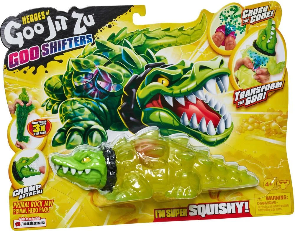Les hĂ©ros de Goo Jit Zu explosent dans leur nouvelle aventure ! Les Shifters ont deux nouveaux amis qui viennent aider nos hĂ©ros ! Ces « animaux primaux » ont un corps transparent et vous pouvez changer de couleur de façon permanente en Ă©crasant le noyau ! Les figurines sont flexibles et Ă©lastiques, alors prĂ©parez-vous pour la bataille primale hĂ©roĂŻque ultime pleine de mouvements de combat flexibles ! Un hĂ©ros Goo Jit Zu peut s’Ă©tirer jusqu’Ă 3 fois sa propre taille et retrouver sa forme d’origine ! Il y a 2 Goo Jit Zu Primals Ă collectionner.Â