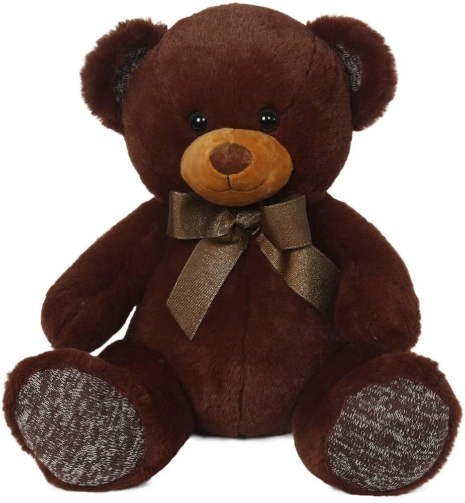 Ours marron en peluche de 38 cm assis avec ruban. Peluche douce au toucher. En polyester, seuls les yeux sont en plastique. Lavable en surface uniquement.
