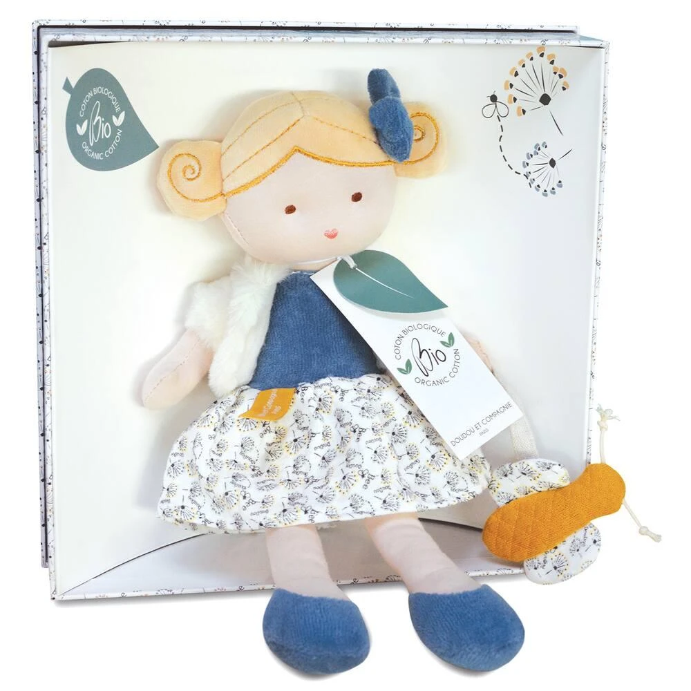 Doudou et Compagnie en créant cette collection BIO pense particulièrement au bien-être des bébés et souhaite aussi, pour leur avenir, sensibiliser le plus grand nombre à une démarche éco-responsable. Les abeilles sont essentielles à l’équilibre des écosystèmes, protégeons-les, ainsi que notre planète. POLLEN est une charmante abeille, tout en coton bio, labelisée GOTS et rembourrée de fibres polyester 100% recyclées. Créée dans des tonalités harmonieuses rappelant subtilement la nature : la couleur jaune doré pour le soleil et la terre d’ocre, l’écru et le lin pour les fibres naturelles et une touche de bleu pour l’eau, élément vital, POLLEN séduit aussi par la richesse visuelle de ses imprimés. Les matières BIO utilisées ont été choisies méticuleusement pour éveiller les sens des enfants. Du coton de velours, du jersey, du lin, du lange de coton ainsi du jersey piqué raffiné rappelant les alvéoles de la ruche, chaque texture apporte un toucher différent. Cette poupée BIO, avec sa petite abeille dans la main, est aussi travaillé avec soin pour être facile à manipuler et répondre à tous les besoins des bébés. Lavage à 30°, séchage naturel ou mécanique à basse température. Inédit ! Ce produit bénéficie de LA GARANTIE DOUDOU. Grâce à son numéro unique, Doudou perdu est vite retrouvé ! Enregistrez votre Doudou et découvrez toutes les garanties sur le site doudouetcompagnie.com