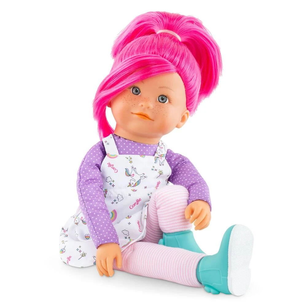 Vois la vie en couleurs avec les Rainbow Dolls ! Fais la connaissance d’une bande de 4 joyeux personnages qui vivent au-dessus des nuages dans un monde fun et rigolo où les licornes se baladent au milieu des champs de barbe à papa !Néphélie est une grande poupée pétillante de 40cm au look fun et coloré ! Elle est habillée d’une robe réalisée dans un tissu exclusif Corolle très tendance; avec des arcs-en-ciel et des licornes. Elle est chaussée d’une paire de bottines derbies assorties non retirables. Son corps souple et léger; ainsi que ses longs bras et ses jambes interminables lui permettent de prendre toutes les positions. Ses mains et sa tête sont en vinyle doux au toucher et à la délicate senteur de vanille. Son visage est constellé de petites taches de rousseur et ses yeux bleu foncé sont fixes.Les cheveux de Néphélie sont d’un rose framboise éclatant. Elle possède une longue mèche de cheveux sur le front et une queue de cheval tenue par un chouchou.Néphélie fait partie de la bande des 4 Rainbow Dolls à collectionner ! Dès 3 ans.