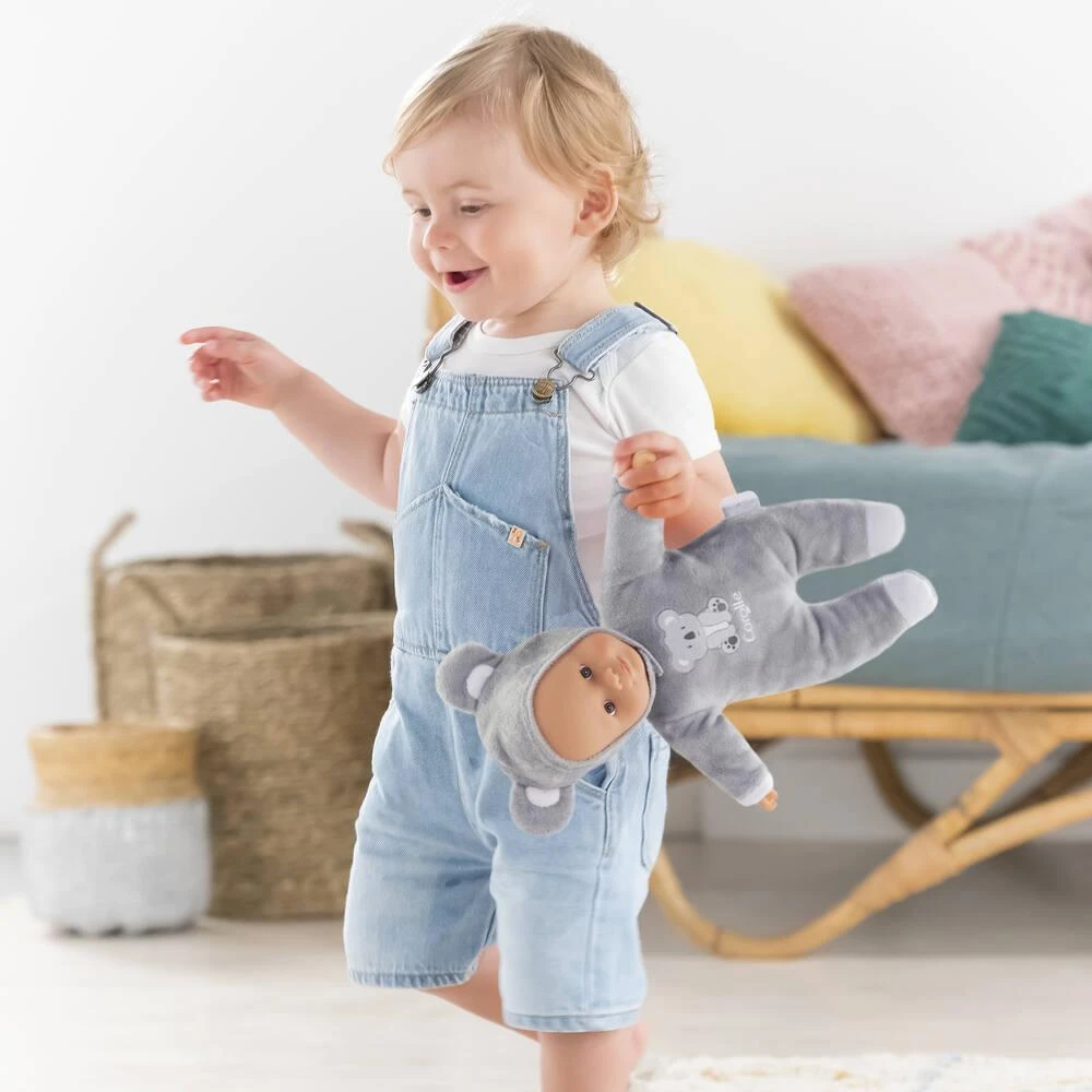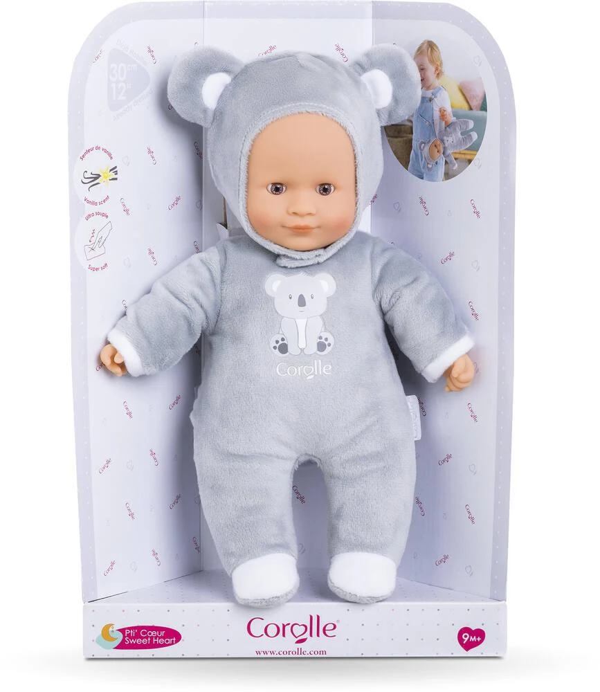 Pti’Cœur Koala est le cadeau idéal pour le premier anniversaire et/ ou le premier noël ! Ce petit poupon de 30 cm a la taille parfaitement adaptée aux petits bras et mains de l’enfant pour être attrapé et manipulé très facilement. Son corps souple sans billes est léger et facile à saisir. Sa tête et ses mains; à la délicate senteur de vanille; sont en vinyle doux au toucher. Sa toile de corps toute douce (non amovible) favorise l’éveil des sens. Sa capuche est munie de deux petites oreilles de koala toutes mignonnes faciles à attraper. Elle peut être retirée mais reste astucieusement attachée grâce à une petite languette située derrière la tête pour éviter de l’égarer. Pti’Cœur Koala possède une étiquette pour écrire le prénom de l’enfant; bien pratique en cas de perte ! Yeux fixes. Lavable à la main en surface. mon doudou Corolle : Toi et moi; pour toujours. tête et bras: vinyle; corps en toile Spun Poly et soft boa 100% Polyester; Bonnet en soft boa et argenté 100% polyester. Rembourrage 100% polyester –
