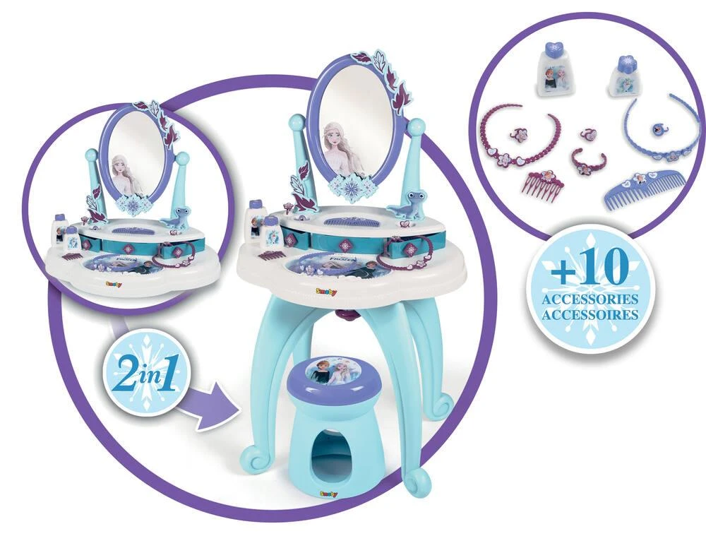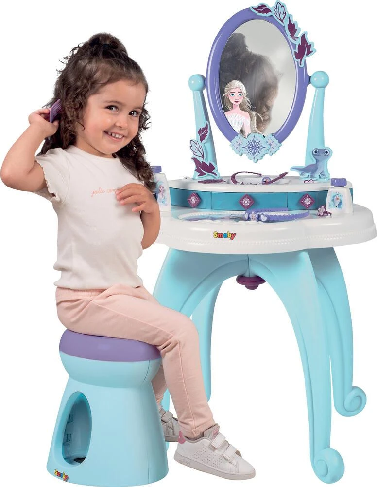 Coiffeuse sur pieds La Reine des Neiges avec un tabouret (max 50kgs) et de nombreux éléments de décor du film d’animation : flocons de neige, feuilles, personnage Bruni. Elle est composée d’un plateau, d’un miroir orientable, et de 3 tiroirs pour ranger les accessoires. Plus de 10 accessoires inclus : 1 tabouret, 2 flacons, 1 collier, 1 serre tête, 3 bagues, 1 bracelet , 1 petit peigne et 1 grand peigne. 2 en 1 : la coiffeuse peut être détachée de ses pieds pour être déposée sur une table.