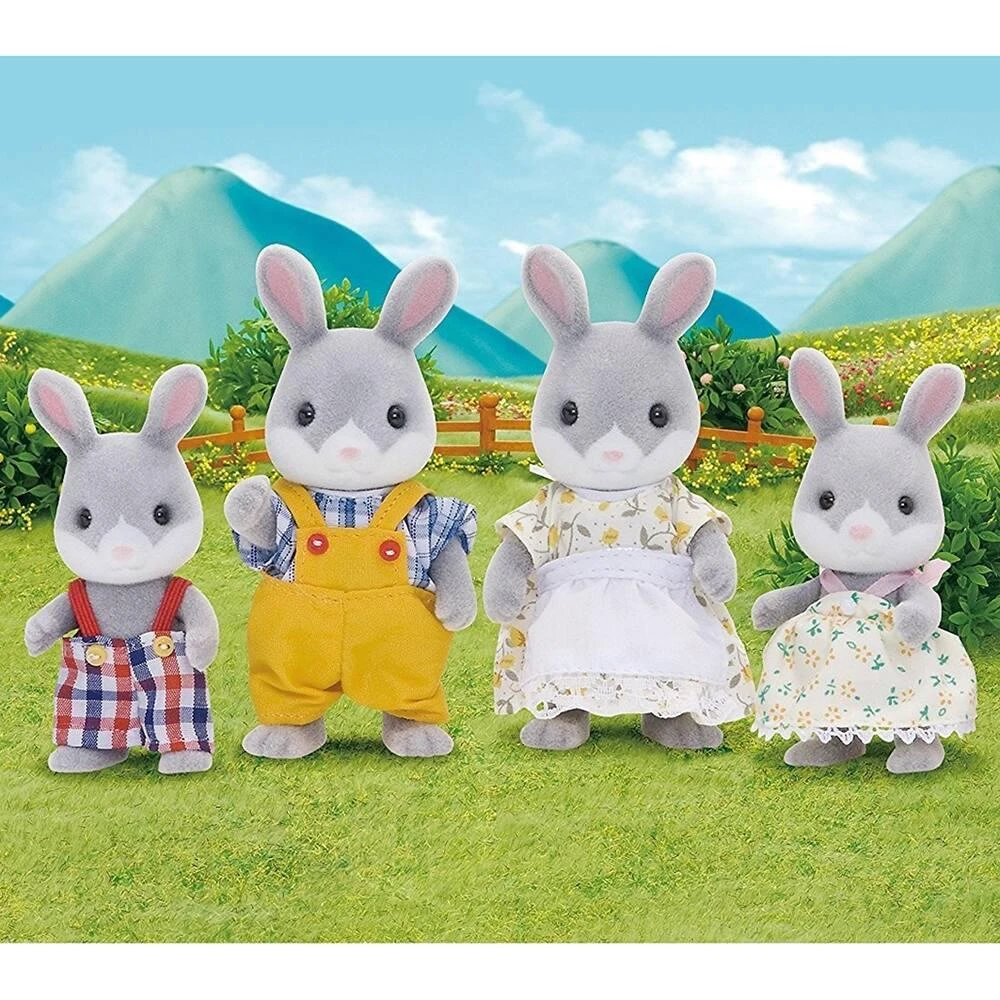 La famille lapin gris est composée de 4 personnages : la maman, le papa, le fils et la fille. Ils sont tous articulés et habillés avec soin. Leurs vêtements peuvent être enlevés et remis à loisir.