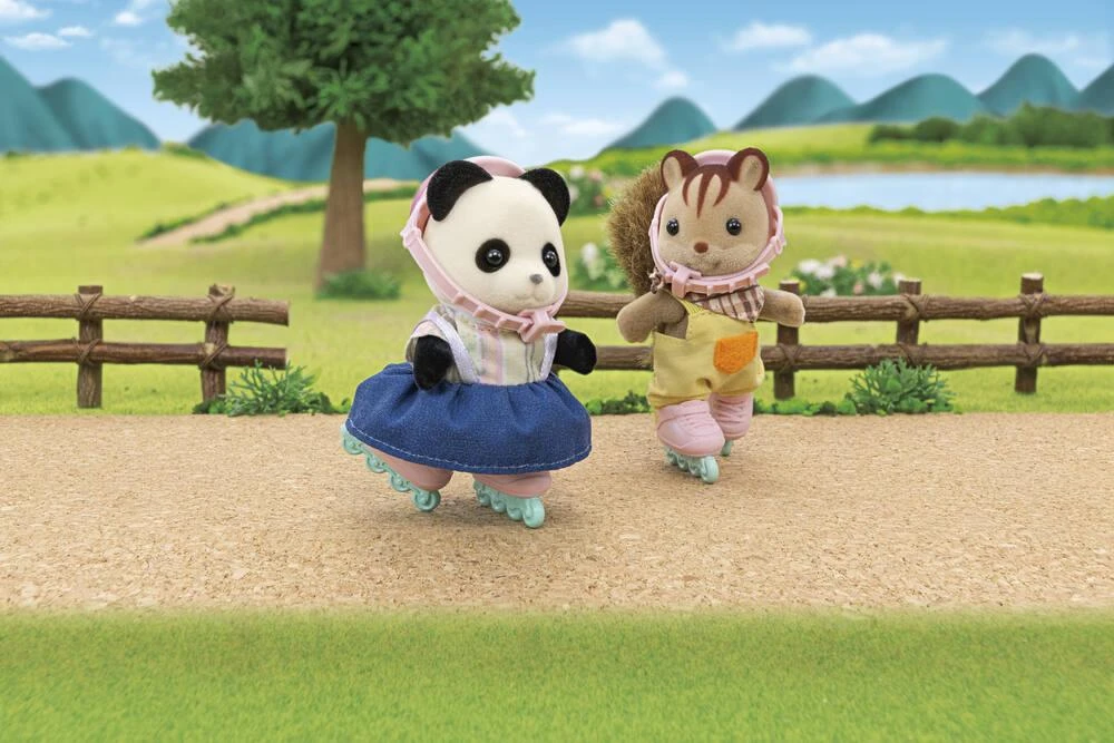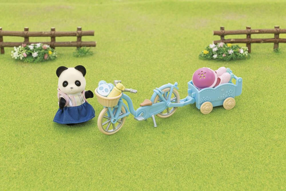 Connectez le vélo à la remorque pour emmener quelqu’un en voyage ou transporter des bagages. Contenu : la figurine de la fille panda, un vélo, une remorque, des patins à roulettes, un casque, un sac à dos, une boîte à biscuits, des biscuits et une gourde et une tasse.