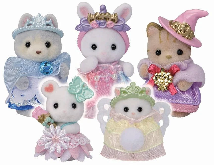 Ce set contient 5 figurines déguisées avec des costumes de princesses et leurs accessoires féériques. La parade des bébés est composée des bébés Lapin Blanc, Husky, Chat Tigré, Souris Marshmallow et Chat Persan. Ils sont tous articulés et habillés avec soin. Leurs vêtements peuvent être enlevés et remis à loisir.