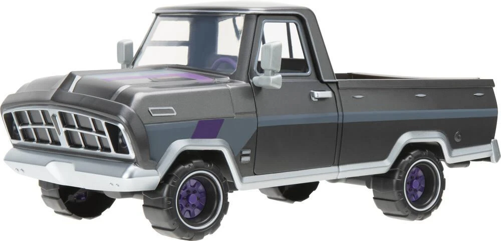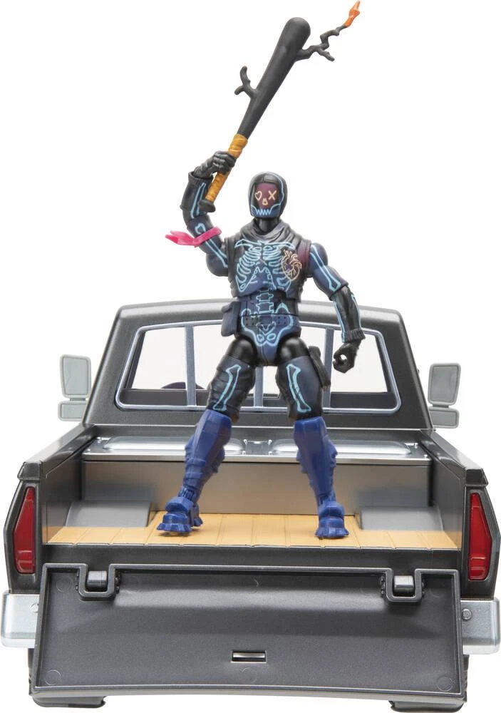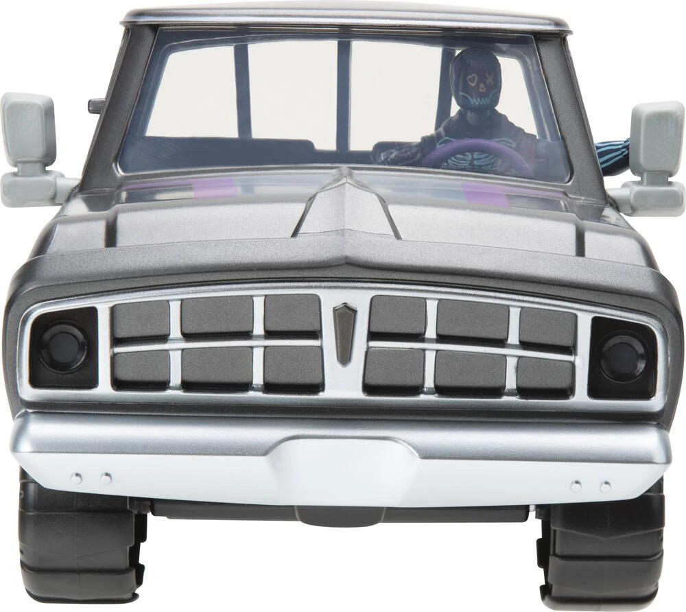 Véhicule The Bear, pick-up. Contient : 1 véhicule à roues libres avec lumières à l’avant, 1 figurine articulée de 10 cm du skin Party Trooper (en français Soldat festif) et 1 arme. Le pick-up peut transporter jusqu’à 6 figurines de 10 cm. Il a un compartiment de rangement pour accessoires. Dimensions du véhicule : 11.9 x 25.5 x 11.6 cm. 2 piles LR03 non fournies. Notice incluse. Licence : Fortnite.
