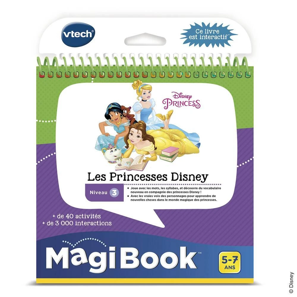 Livre de 32 pages illustrées pour faire le plein de découvertes avec les Princesses Disney. Des chansons, musiques et plein de voix amusantes pour guider l’enfant. Avec les vraies voix des personnages. Des autocollants inclus que l’enfant colle dans son tableau des récompenses au fur et à mesure qu’il progresse dans le livre et dans ses apprentissages. Contenu audio à télécharger en connectant la plateforme MagiBook à l’ordinateur (plateforme Explor@ Park). Ce livre nécessite la plateforme éducative MagiBook.