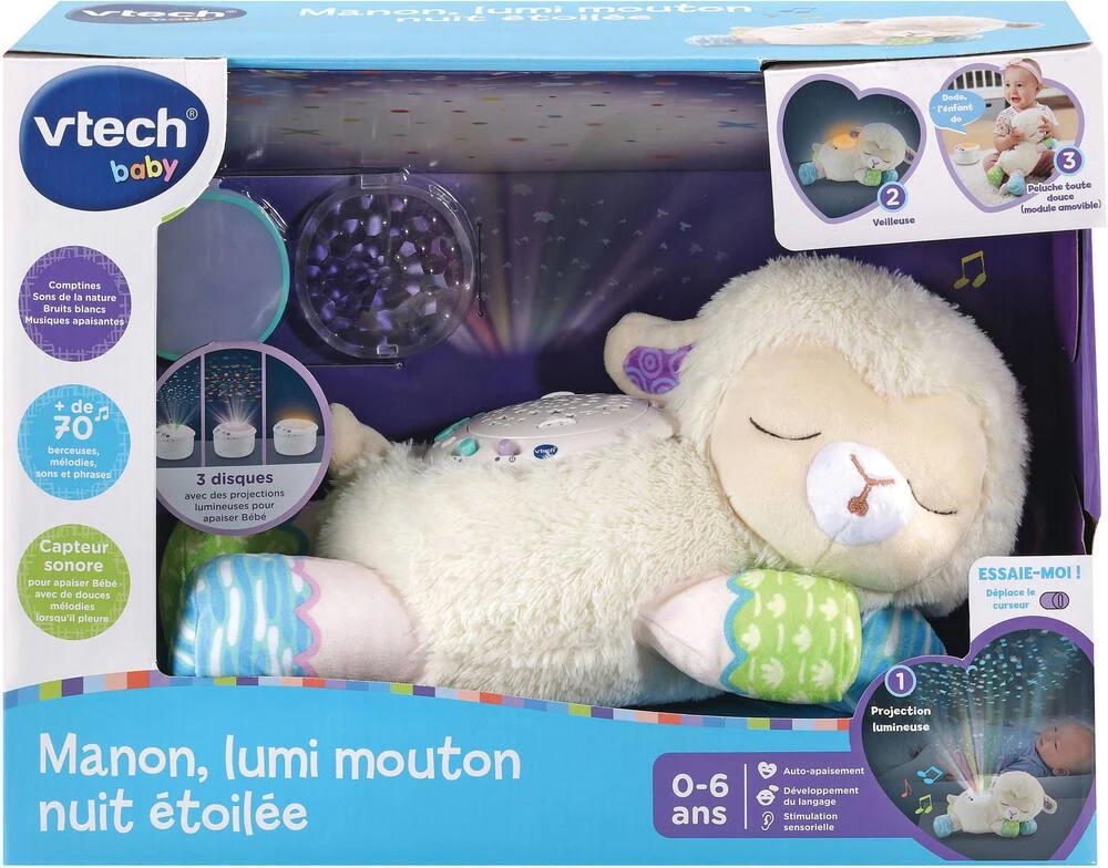 Manon, lumi mouton nuit étoilée 3 en 1 – 0 – 6 ans Un mouton 3 en 1 pour aider Bébé à s’endormir : veilleuse / module électronique détachable / peluche toute douce. 3 types de projection : lumière diffuse, ciel étoilé et nuages (sous forme de disques à insérer sur le module électronique) 3 modes d’écoute : chansons et mélodies, histoires pour s’endormir et bruits blancs Capteur sonore qui déclenche automatiquement des sons et mélodies pour apaiser Bébé lorsqu’il se met à pleurer. Réglage du volume sonore et de la projection lumineuse Minuteur 15/30/45 min Grâce au module électronique détachable, la peluche devient un vrai compagnon tout doux pour l’enfant. Peluche lavable en machine. 3 chansons, 35 mélodies et 5 histoires pour s’endormir. Arrêt automatique.