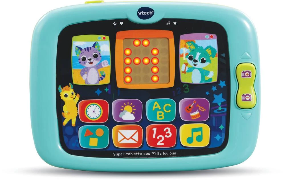 Super tablette des P’tits Loulous – 12 – 36 mois 100% tactile et lumineuse, la tablette permet aux tout-petits de faire de nombreuses découvertes tout en imitant les plus grands. Elle se compose de : 8 activités pour écouter de la musique, lire ses messages et découvrir l’alphabet, les chiffres, les formes, la météo, les moments de la journée et les instruments de musique. 2 écrans d’appel en visio pour parler avec Mina le chat et Titou le toutou. 2 boutons pour s’amuser à zoomer et dézoomer. En balayant l’écran avec son doigt comme sur une vraie tablette, Bébé déclenche des animations amusantes . + de 160 mélodies, chansons, sons et phrases. Réglage du volume sonore et arrêt automatique. Fonctionne avec 3 LR03.