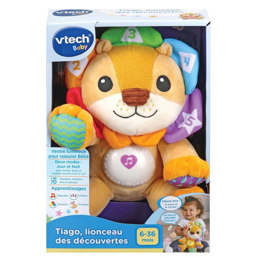 Tiago lionceau des découvertes. De 6 à 36 mois. 2 modes de jeu : Mode Jour : Bébé découvre les chiffres et les couleurs en appuyant sur le bouton lumineux sur le ventre (avec variations de couleurs). Mode Nuit : Tiago aide bébé à s’endormir en jouant des mélodies apaisantes et/ou en s’illuminant de jolies couleurs. Une crinière colorée avec du papier bruissant pour développer le sens visuel et le toucher de Bébé. 3 chansons et 15 mélodies. Plus de 70 chansons, phrases, mélodies et sons amusants. Module électronique détachable pour lavage en surface. Arrêt automatique.