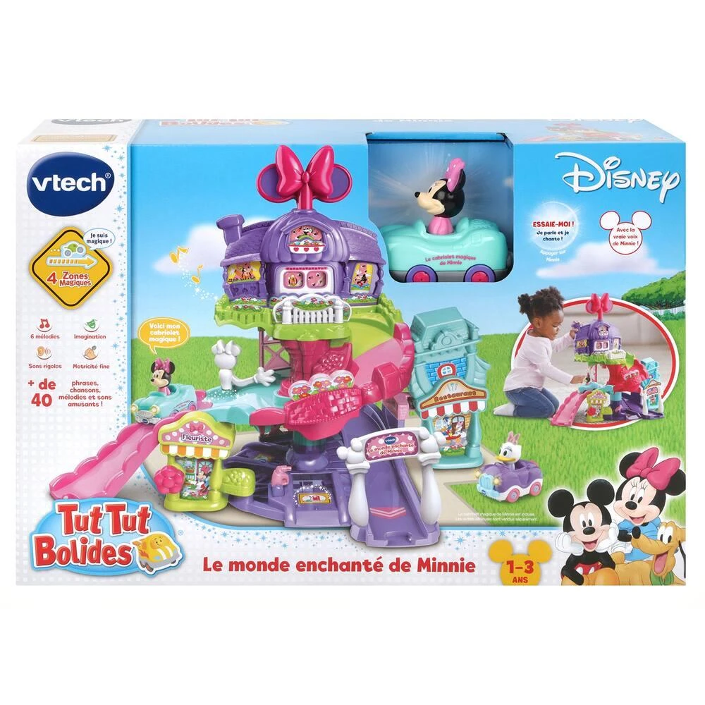 Minnie parle et chante dans son cabriolet magique. Pour faire interagir le personnage, il suffit d’appuyer dessus ou de faire passer le véhicule sur une zone magique. À l’aide du lanceur, Minnie descend à toute vitesse la piste ! L’enfant développe sa motricité en manipulant de nombreux éléments : fleur, aiguillage, pompe à essence et bien plus encore ! Magique ! En appuyant sur le nœud papillon au sommet de la maison, Figaro le chat apparaît. 3 chansons, 4 mélodies, des phrases et des sons rigolos rythment le jeu. 4 Zones Magiques. Avec la voix de Minnie ! Age : de 1 à 3 ans.